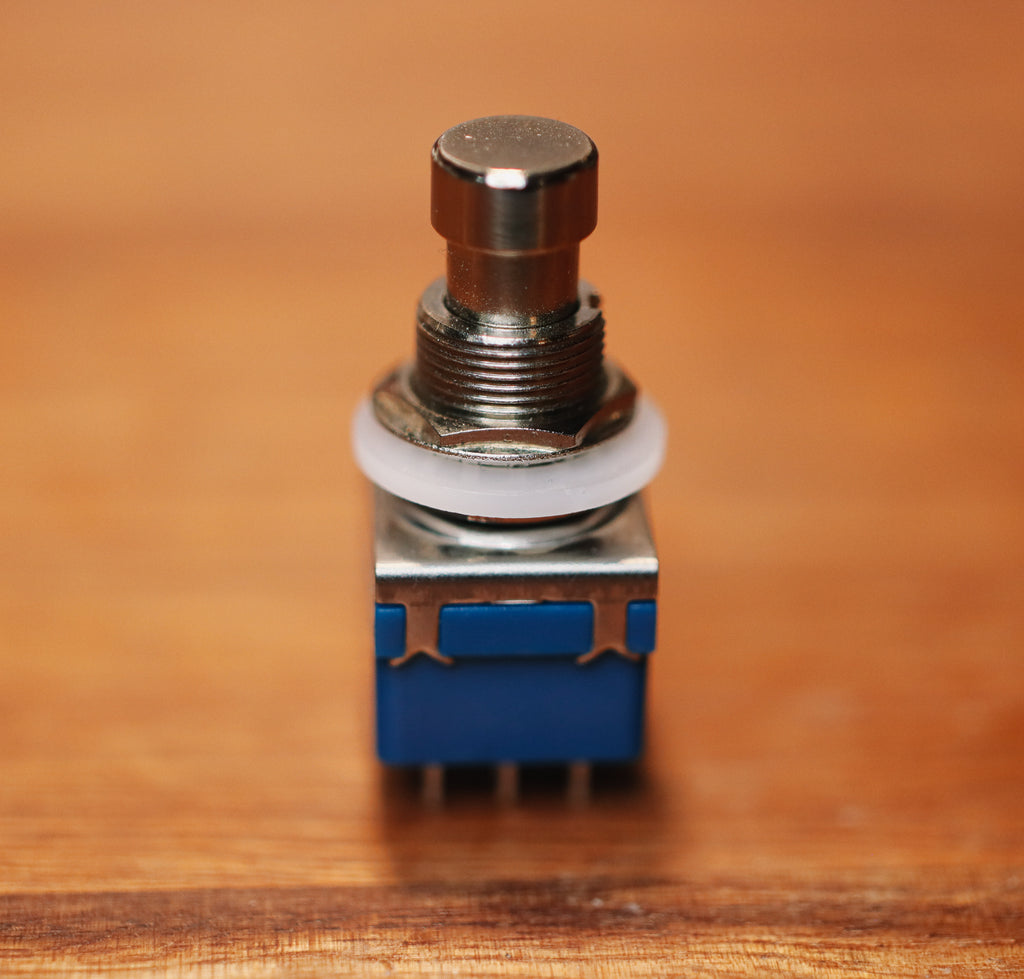 This is a latching 3-pole, double-throw switch that works well for guitar pedal effect pedals. This 9-pin switch can also be used to enable True Bypass i.e., to completely bypass the effect circuitry when your effect is turned off.